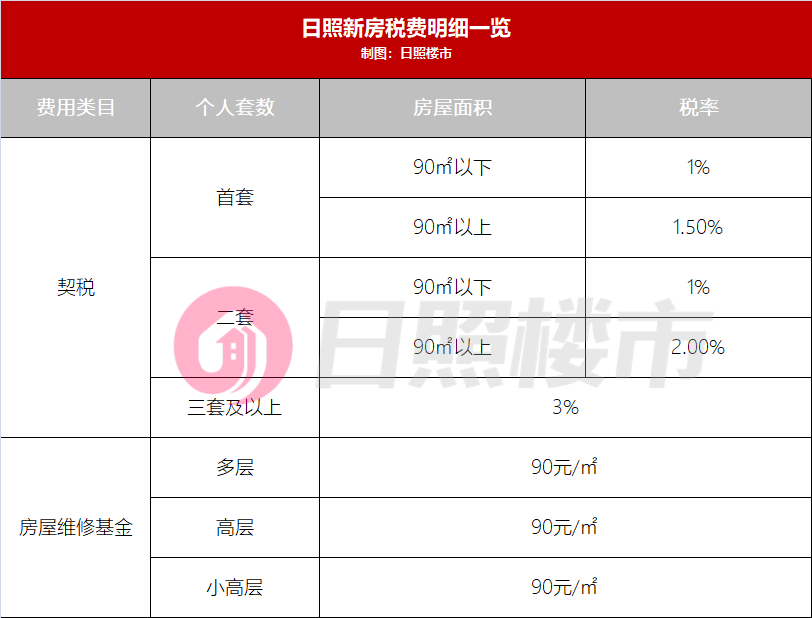1.契税。首套房:90㎡以下,契税1%;90㎡以上,契税1.5%;二套房:90㎡以下,契税1%;90㎡以上,契税2%;三套及以上:一律为3%。