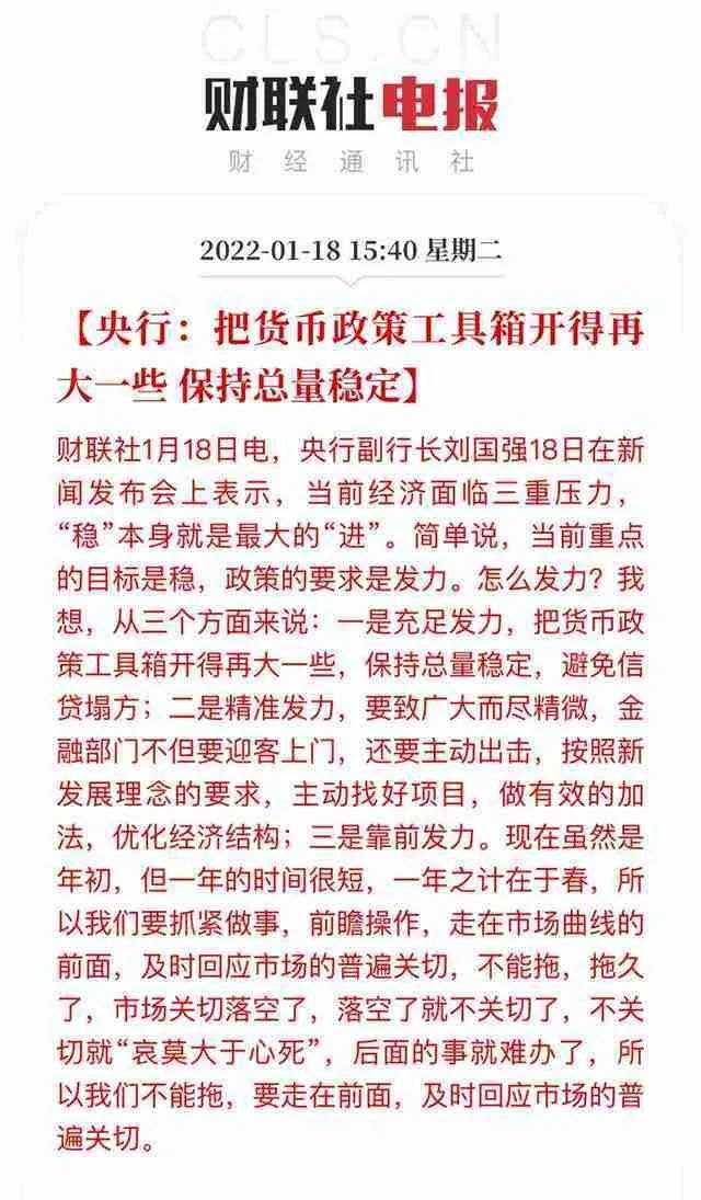 与此同时,央行副行长刘国强表示:把货币政策工具箱开得再大一些,保持总量稳定。